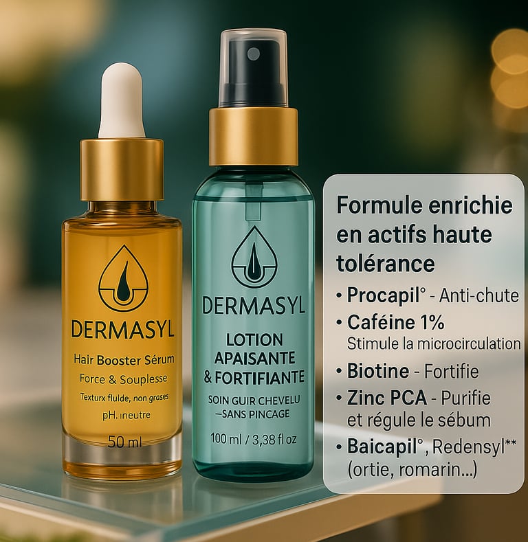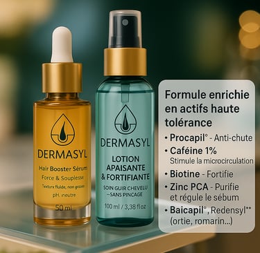 Chez Dermasyl, nous développons des soins capillaires de dernière génération, spécifiquement formulés pour lutter contre la perte de cheveux, favoriser la repousse et entretenir une chevelure saine et forte.